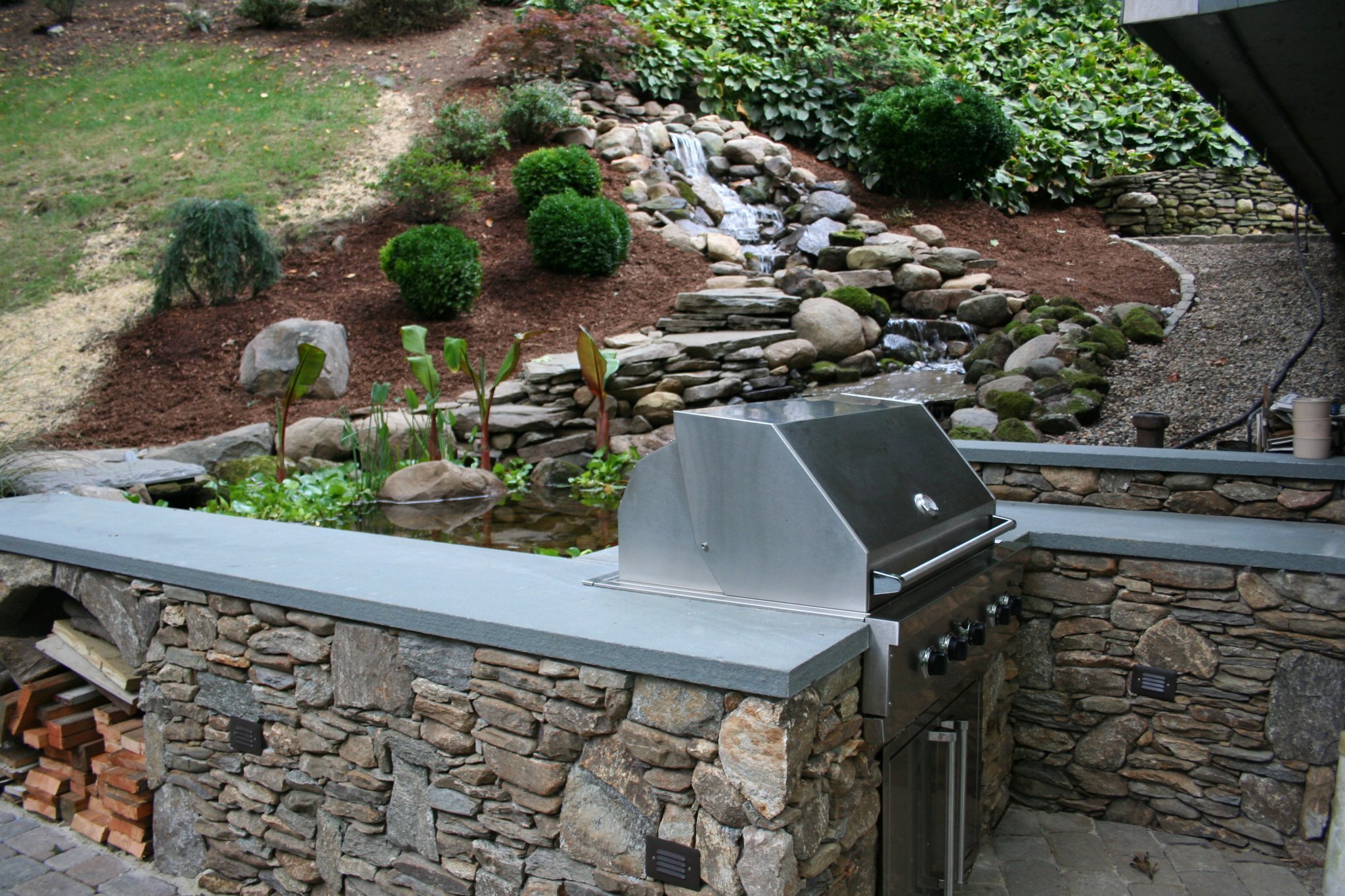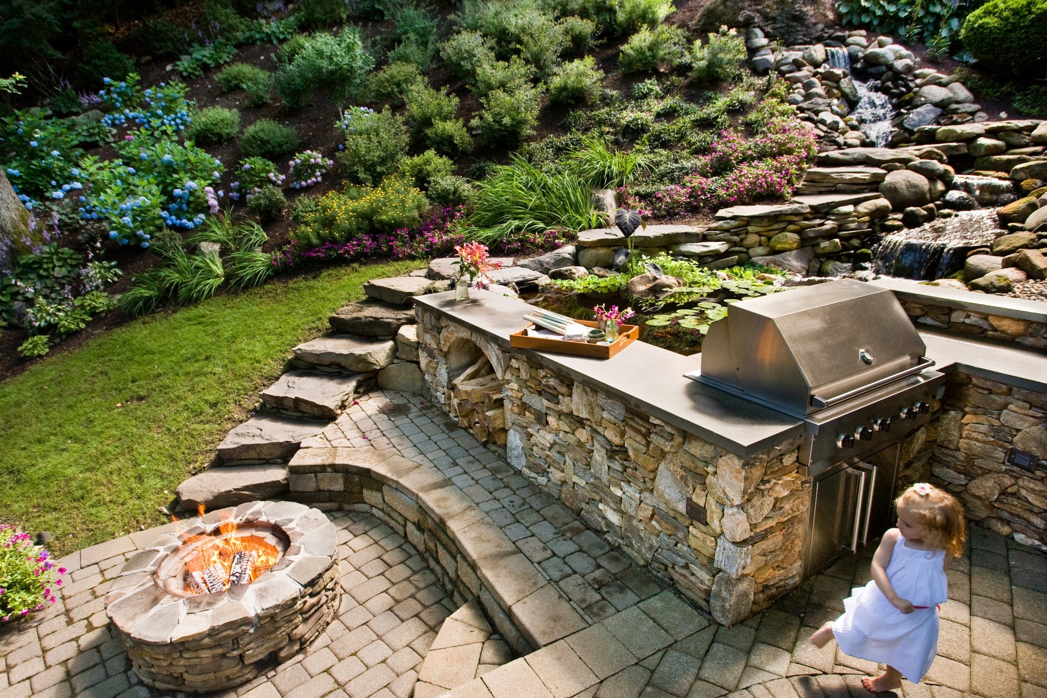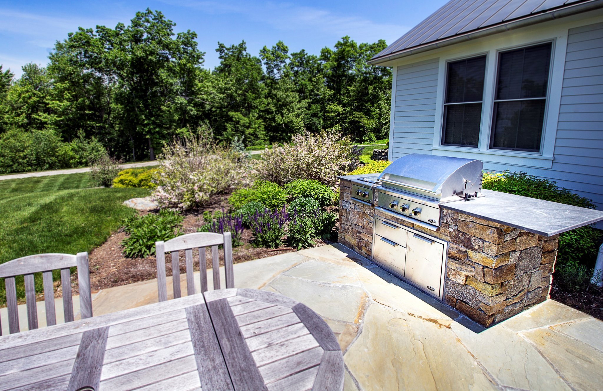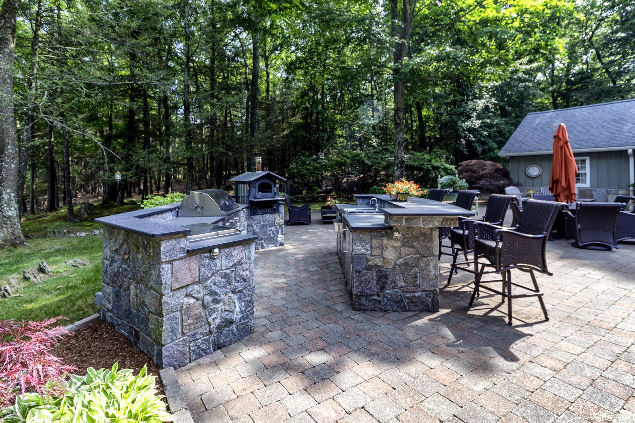 Our most cherished memories are often of fun times outdoors with family and friends enjoying great food and lots of laughs. With a beautiful and functional outdoor kitchen you can easily combine the two! While a simple grill, table and chairs can facilitate a great evening, we find that a custom kitchen built to reflect your lifestyle and designed for your needs can far surpass a table and chairs. Plus, no one gets “stuck” in the house doing all the cooking because as we all know, everyone seems to gather in the kitchen anyway. While designing the outdoor kitchen of your dreams, we take into consideration your personal style and your property features to far exceed your expectations. Below are a few examples of amazing outdoor kitchens we have created.